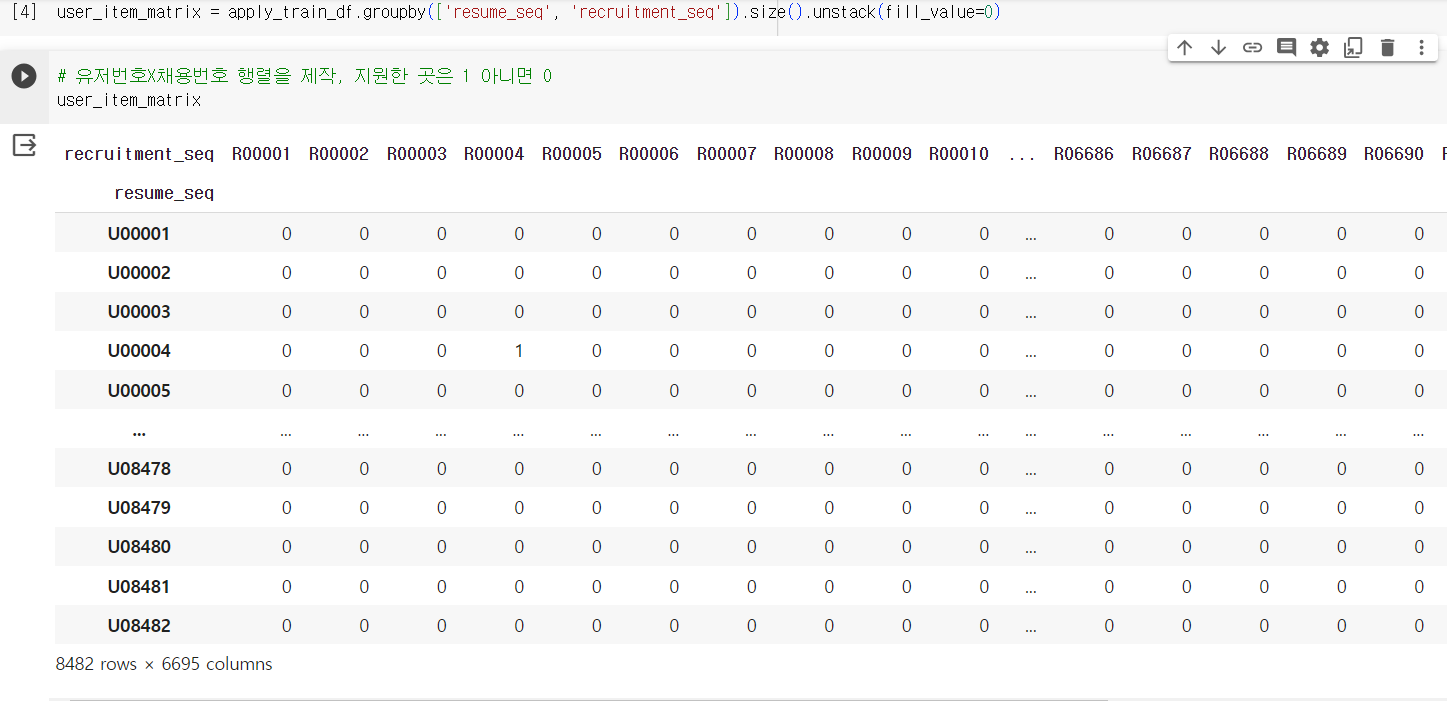 apply_train_df를 'resume_seq(지원자 번호)', 'recruitment_seq(채용 번호)' groupby해 2X2 Matrix로 표현한다.