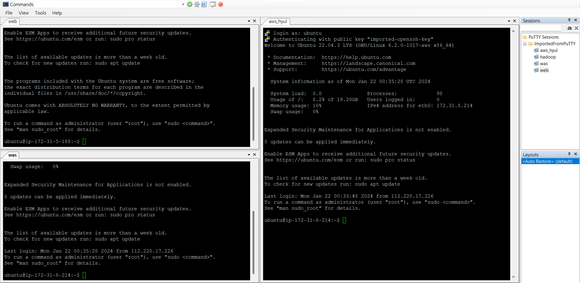 그 후 SuperPuTTY를 설치해 화면을 3개 쓸 수 있게 했다.